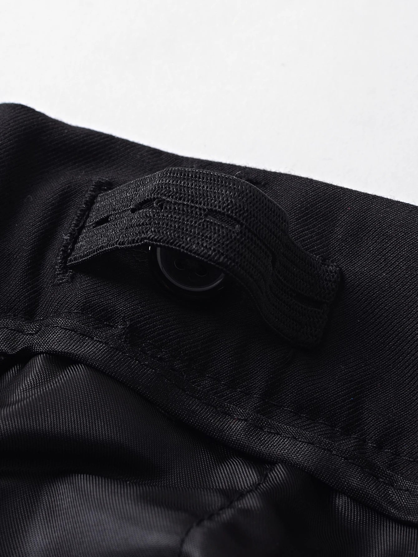 - Closure: Single-breasted jacket, flat-front pants with elastic waist