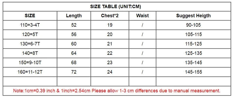 | U.S. Size | Tag Size | Length | Chest (flat) | Approx. Height |