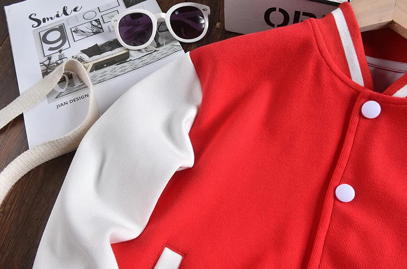 kids baseball jacket, varsity jacket for boys, girls outerwear, spring fall kids coat, lightweight jacket for children, cruise outfits for kids, black red blue varsity coat, back to school jacket, travel fashion for kids, toddler jacket spring