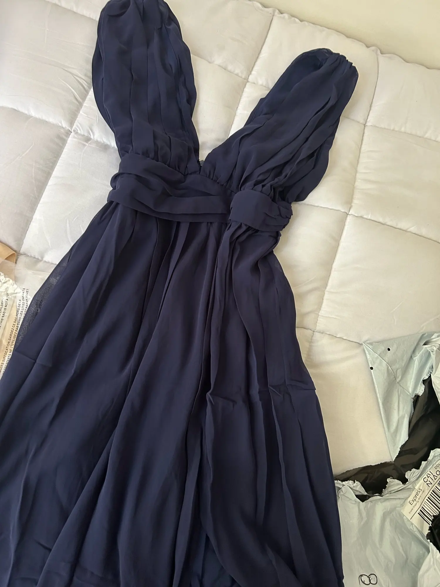 It's just as described. The color is very cute and the quality looks and feels very good. However, for me (who is short) it's a bit short hahaha (the lining at the bottom is shorter than the chiffon fabric on the outside of the dress, so it looks strange, but it goes unnoticed with lower heels. Anyway, I loved it for the price!