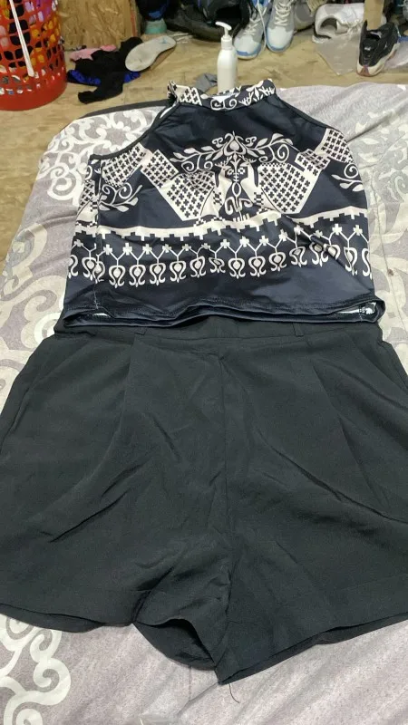 - Pattern: Floral print top with solid-color shorts