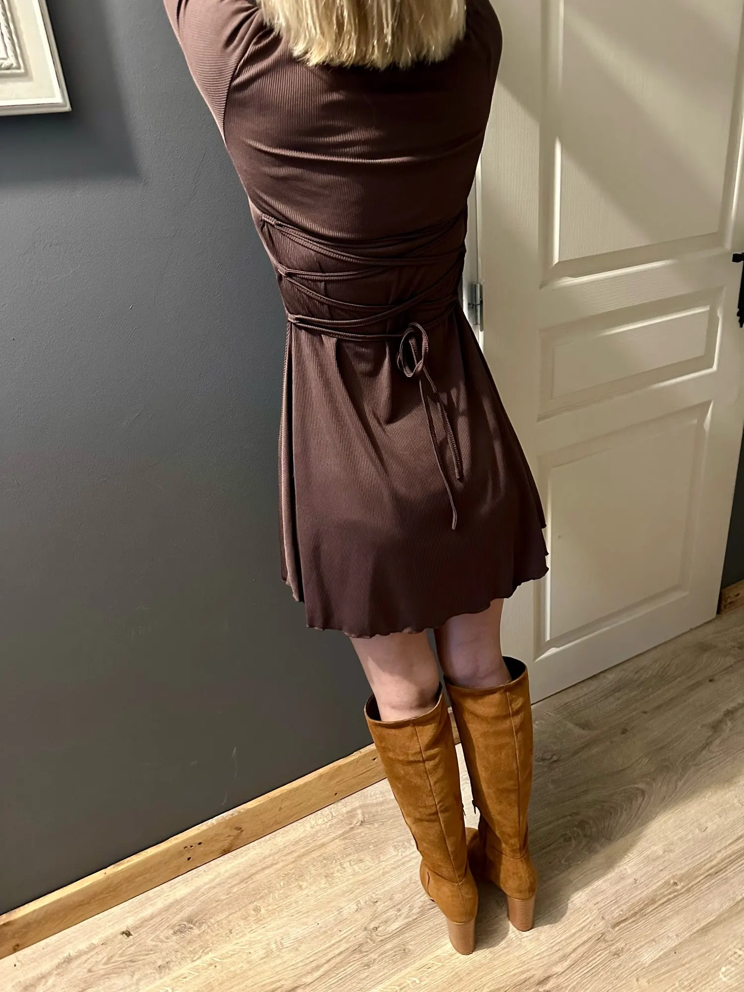 Women’s Lace-Up Back Mini Dress – Long Sleeve, Ribbed Knit, Flared Hem