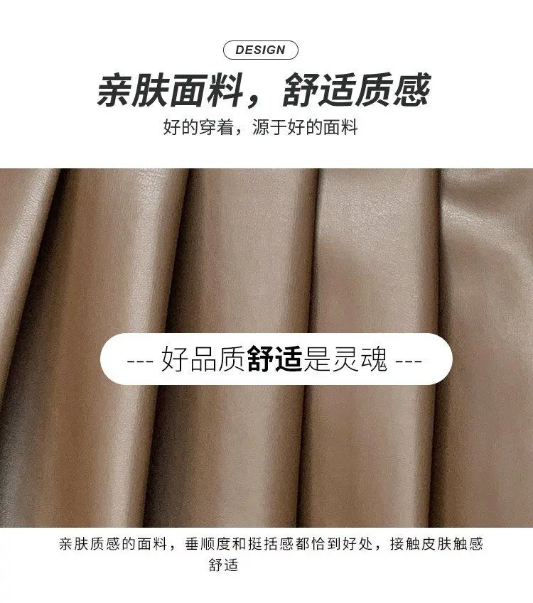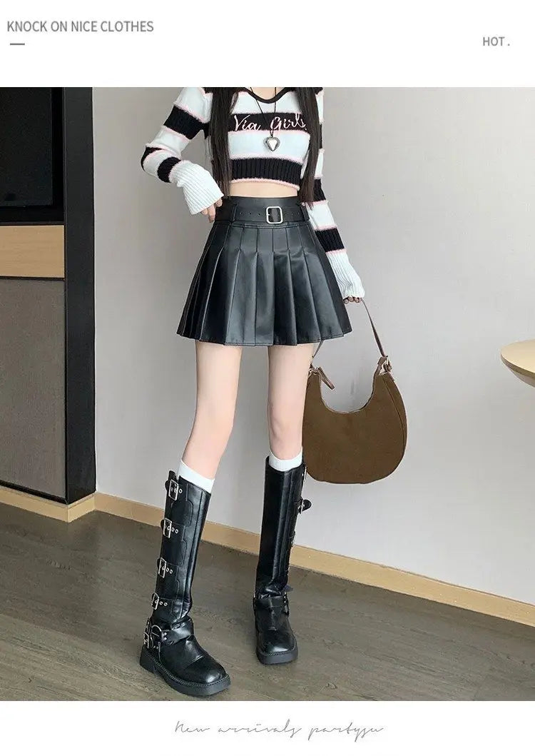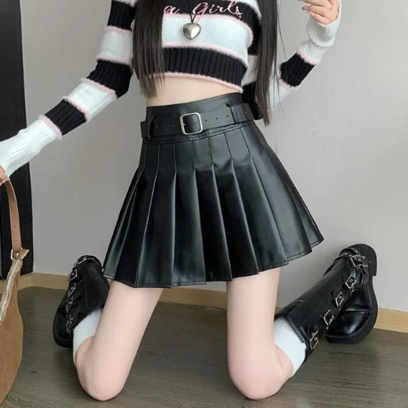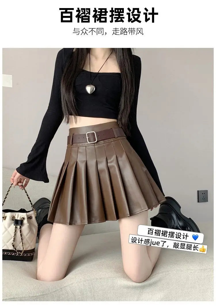 Women’s Pleated PU Mini Skirt with Belt – High-Waist, A-Line